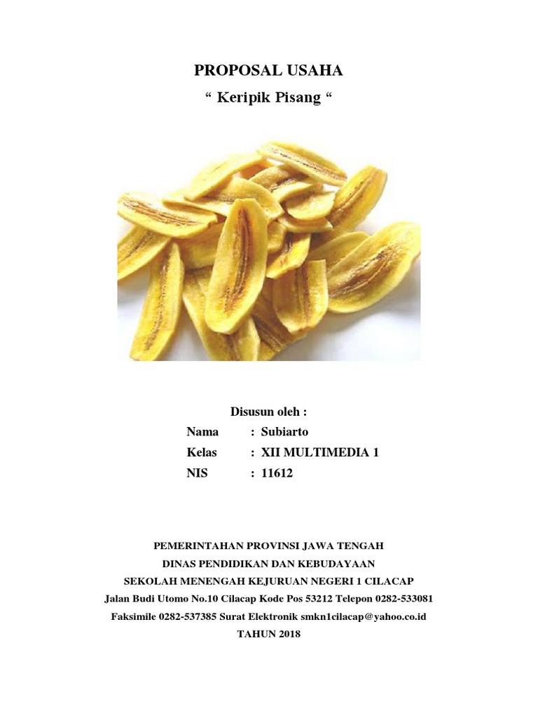 Contoh proposal keripik singkong (kwu)posted byjelajah internet,add commentincontoh proposalonthursday, november 06, 2014. Diajukan untuk memenuhi tugas pelajaran bahasa indonesia. Proposal bisnis keripik pisang a. Proposal seni budaya seni musik bab i pendahuluan a. Contoh proposal rencana usaha keripik talas. Hal ini dikarenakan dalam proposal anda telah merinci berbagai aspek yang. Proposal usaha keripik semanggi khas surabaya. Perum harvest city blok of20/15 cileungsi bogor. Untuk memenuhi saah satu tugas kuiah. Keripik pisang merupakan salah satu produk makanan ringan yang banyak digemari konsumen. Keripik pisang merupakan salah satu makanan jajanan yang sangat disukai oleh masyarakat. Bermitra dengan bumn atau perusahaan swasta yang sudah memiliki manajemen, usaha berjalan minimal 2 tahun dan sertakan proposal. Kebetulan pada artikel kali ini saya akan memberikan contohnya secara lengkap kepada kalian semua.
